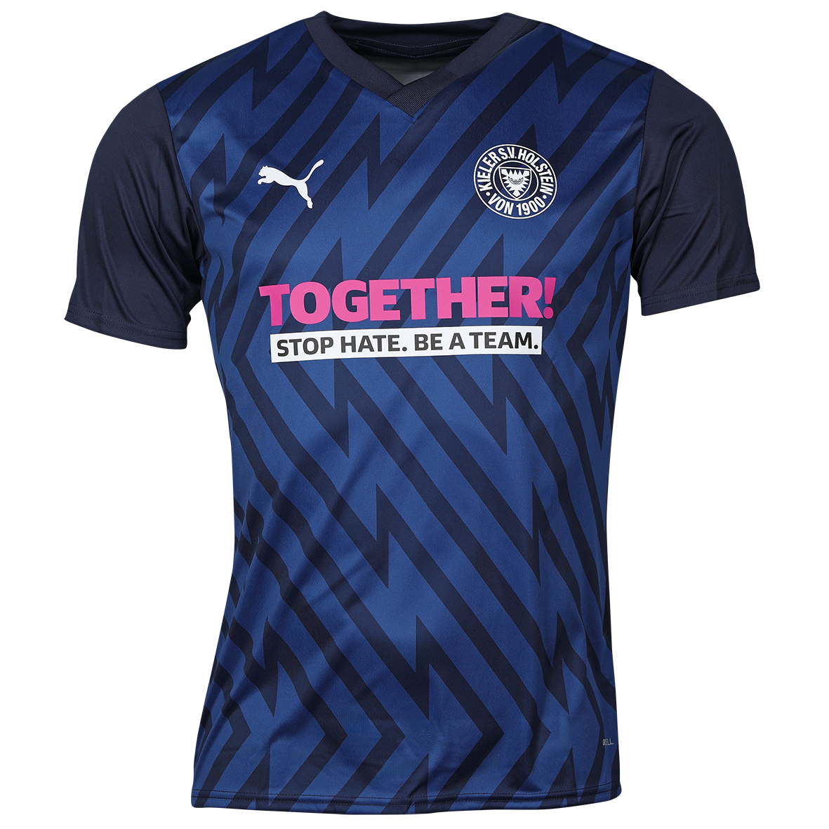 Mit dem „Together“-Spieltag setzt der Profifußball ein klares Zeichen für Vielfalt, Toleranz, Respekt, Zusammenhalt und Empathie. Mit dem Puma-Trainingsshirt unserer KSV Holstein bist auch du dabei! Das schwarze, dynamische Muster auf dunkelblauem Hintergrund sorgt für einen energiegeladenen Look. Verziert wird das Shirt mit dem Schriftzug „Together! Stop Hate. Be a team.“ sowie dem KSV-Wappen.