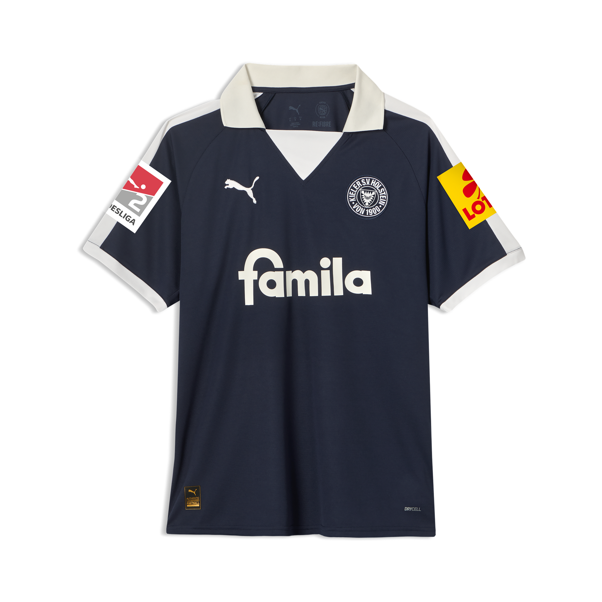 Tradition in jeder Faser: Zum 125-jährigen Bestehen der KSV Holstein tragen unsere Störche am 25. Oktober gegen den VfL Bochum ein ganz besonderes Stück Vereinsgeschichte. Das exklusive Jubiläumstrikot in edlem Dunkelblau mit klassischem weißen Kragen erinnert an die erste Saison in der 2. Liga Nord 1978/79, eine der emotionalsten Spielzeiten der letzten 50 Jahre.